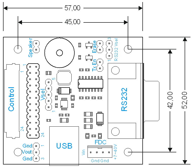 DPA-PCBRS232-2x is an interface board for connecting a color iLCD panel with 20/24-pin FFC cable to the USB port or RS232 port. Input voltage can be 5V or 7 - 40V with an integrated switcher. A mini-speaker for signalling is included.