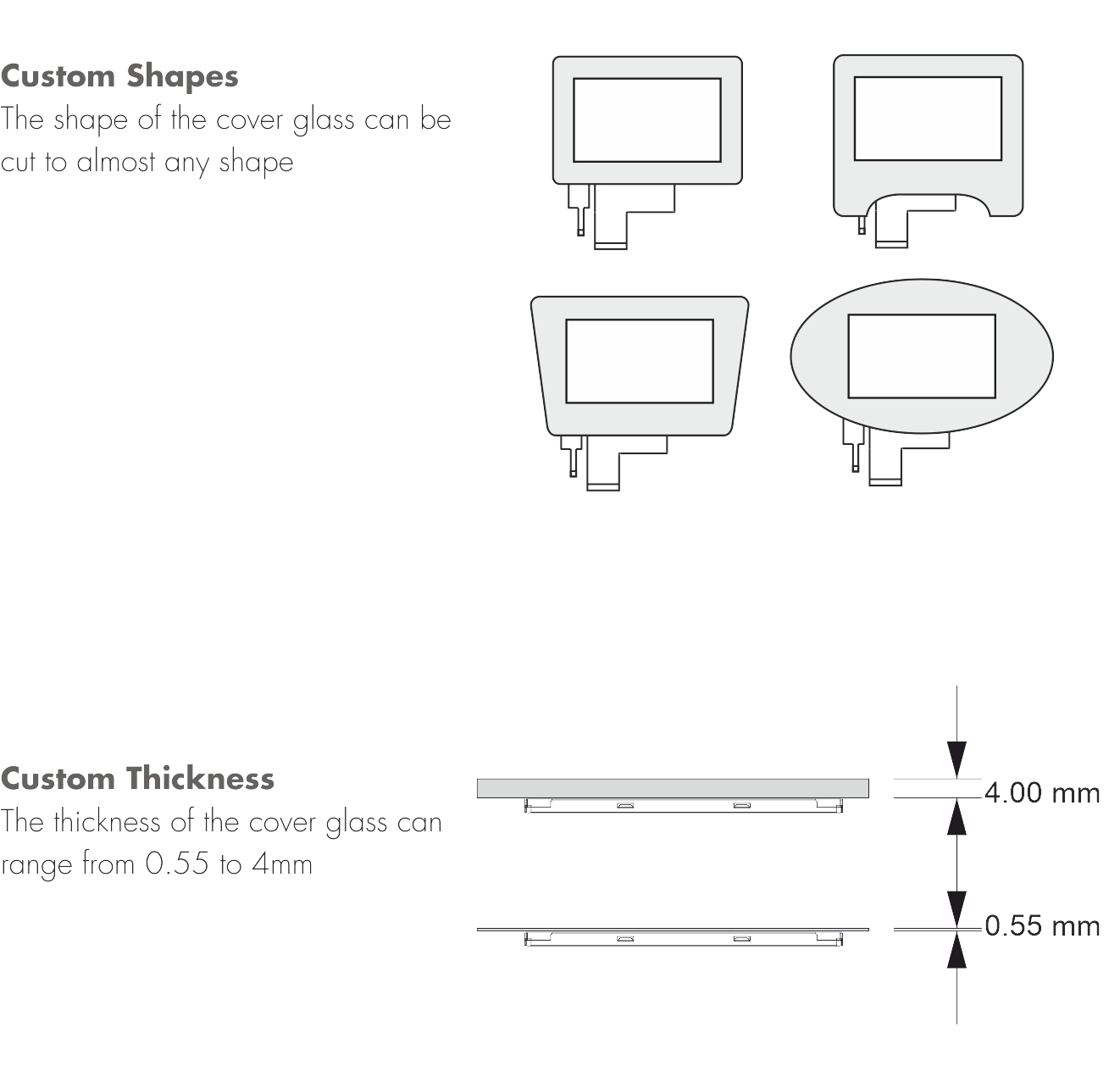 Our LCD Pure and LCD Pure X series do not only impress because of their high-end quality but also allow customers to stand out because of our wide range of customization options. Save time, costs and effort by choosing us instead of relying on a variety of suppliers to purchase and bond your LCD, touchpanel and cover glass. We offer a one-stop solution for your specific needs. Our specialized supplier network, allows us to offer a variety of modifications to the LCD, starting from a MOQ of 500pcs. only. The options include changes to the cover glass for better protection and usability, adding adhesive solutions for easier integration and different color or logo print options to increase your brand recognition value.