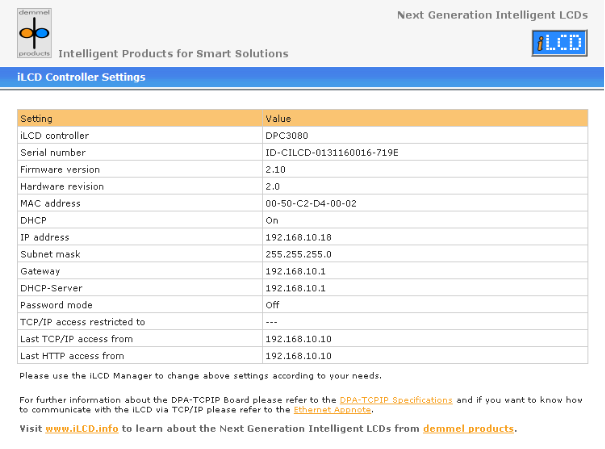 The iLCD device has a built in http server on port 80. If you go to the IP address of the device with a web browser you will see a page with information about the device.